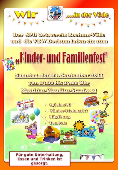 Der SPD-Ortsverein Bochum-Vöde und die VBW Bochum laden zum Kinder- und Familienfest an der Matthias-Claudius-Straße 14. Das Fest findet statt am 03. September von 1e bis 19 Uhr.