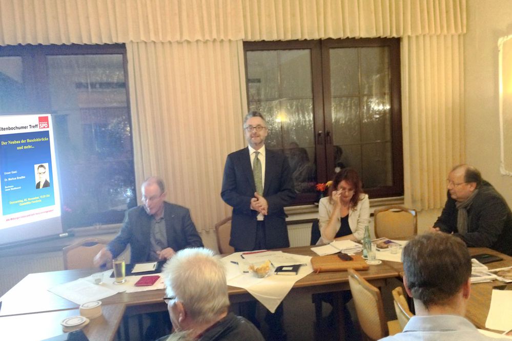 Eigentlich war er gekommen, um über den Neubau der Buselohbrücke zu informieren, mit dem inzwischen – endlich - begonnen worden ist. Doch dabei beließ es der neue Mann im Verwaltungsvorstand des Bochumer Rathauses nicht, der sich den Anwesenden zunächst persönlich vorstellte. Vielmehr nutzte er seinen ersten Besuch bei einem SPD-Ortsverein, seine Vorstellungen zur künftigen Stadtentwicklung zu skizzieren.