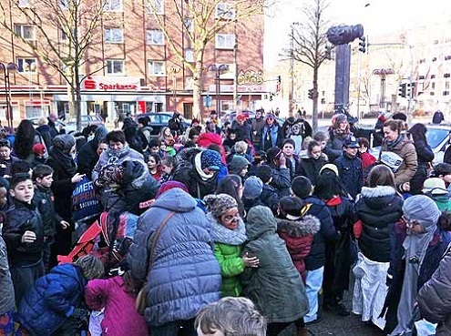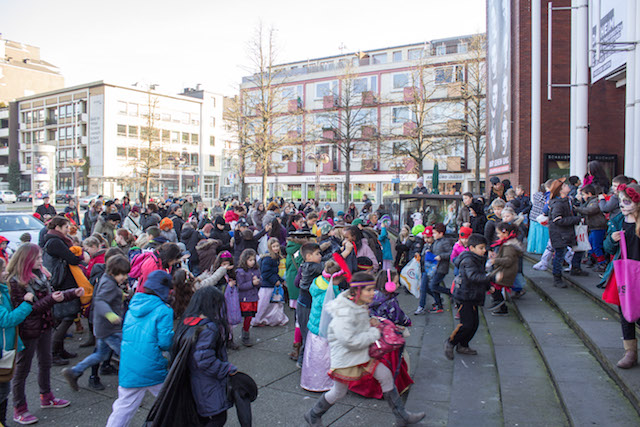 Auf dem Platz vor dem Schauspielhaus führten die Kinder ein einstudiertes Tänzchen auf. Danach zog der Troß wieder Richtung Schule, wo die Kinder für den Freitag unter großem Hallo schulfrei bekamen.