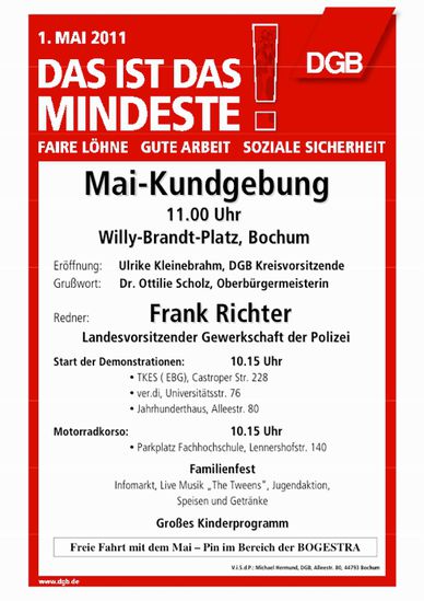 es gehört zur Tradition unserer Partei, am Tag der Arbeit mit unseren Gewerkschafts- kolleginnen- und Kollegen zu demonstrieren. Daher ist es selbstverständlich, dass wir am Sonntag, 1. Mai um 11 Uhr, auf dem Willy-Brandt-Platz an der Kundgebung des DGB mit Ottilie Scholz, Ulrike Kleinebrahm (DGB Kreisvorsitzende Bochum) Frank Richter (GdP-Landesvorsitzender) teilnehmen.