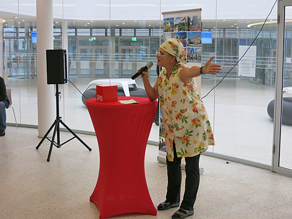Nach den politischen Reden trat dann noch Esther Münch in ihrer bekannten Rolle als Putzfrau Waltraud Ehlert auf, die die anwesenden Gäste gekonnt “ablederte” und sich dabei direkt auf ihre Reden bezog.