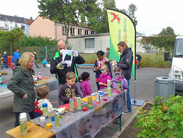 Neben den Spielgeräten des Spielmobils und Kinderschminken, gab es in diesem Jahr zum ersten Mal auch ein Street-Art-Angebot, bei dem die Kinder mit Hilfe von Schablonen, Abtönfarben und Sprühfarben auf „Brettchen“ individuelle Kunstwerke erschaffen und anschließend mit nach Hause nehmen konnten.