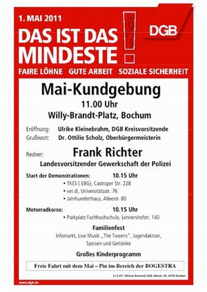 es gehört zur Tradition unserer Partei, am Tag der Arbeit mit unseren Gewerkschafts- kolleginnen- und Kollegen zu demonstrieren. Daher ist es selbstverständlich, dass wir am Sonntag, 1. Mai um 11 Uhr, auf dem Willy-Brandt-Platz an der Kundgebung des DGB mit Ottilie Scholz, Ulrike Kleinebrahm (DGB Kreisvorsitzende Bochum) Frank Richter (GdP-Landesvorsitzender) teilnehmen.
