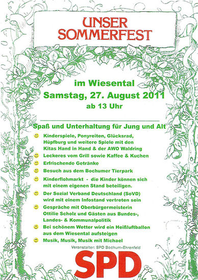 Wie in jedem Jahr veranstaltet die SPD Ehrenfeld auch im Jahre 2011 wieder das traditionelle Wiesentalfest. Los gehts am Samstag, den 27. August ab 13 Uhr.